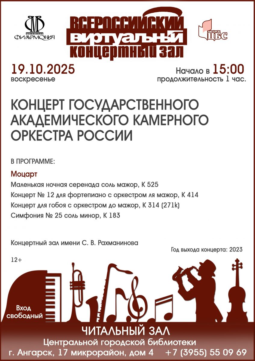 В исполнении Государственного академического камерного оркестра России прозвучат произведения великого австрийского композитора Вольфганга Амадея Моцарта. В программе – «Маленькая ночная серенада», Концерт № 12 для фортепиано с оркестром, Концерт для гобоя с оркестром, Симфония № 25.