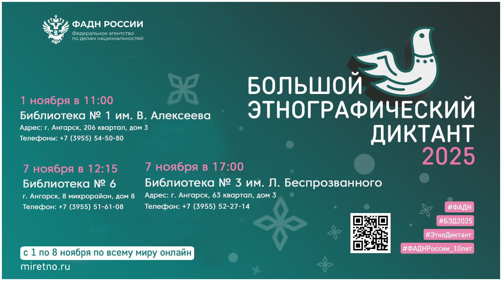 Приглашаем всех желающих оценить свои знания в истории, культуре и традициях народов, проживающих в России. Централизованная библиотечная система предлагает 3 площадки для написания Диктанта: