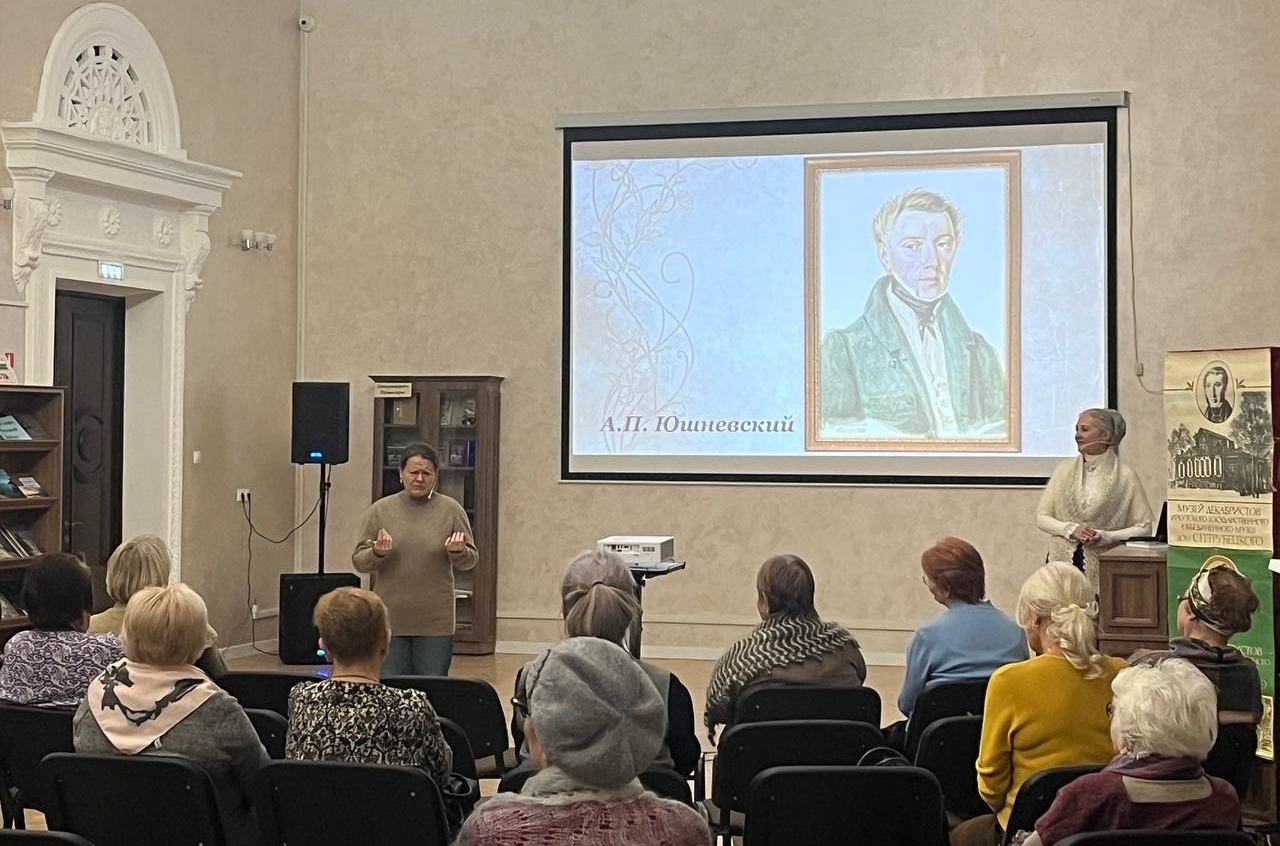 Исторический экскурс в век позапрошлый провела автор исследования – Ирина Выборова, научный сотрудник Дома-музея Трубецких. Дополняли лекцию музыкальные композиции и поэтические чтения. Наталья Кузьминых – библиотекарь, «хозяйка» музыкальной гостиной – вложила в поэтическую композицию все тревоги и чувства, которые переживали ссыльные декабристы, оторванные от близких и родного дома. Классические музыкальные произведения для слушателей исполнили преподаватель Детской школы искусств № 3 Ирина Михайловна Вернохаева и ее ученица Екатерина Кабакова (фортепиано), а также юные виртуозы – учащиеся ДШИ № 4 Михаил Разногузов (скрипка) и Павел Филиппов (кларнет) – в сопровождении концертмейстера Елены Викторовны Омшиной.