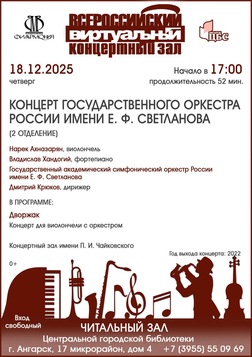 Виртуальный зал Центральной городской библиотеки Ангарска представляет концерт в двух отделениях Государственного оркестра России имени Е. Ф. Светланова под управлением дирижера Дмитрия Крюкова.