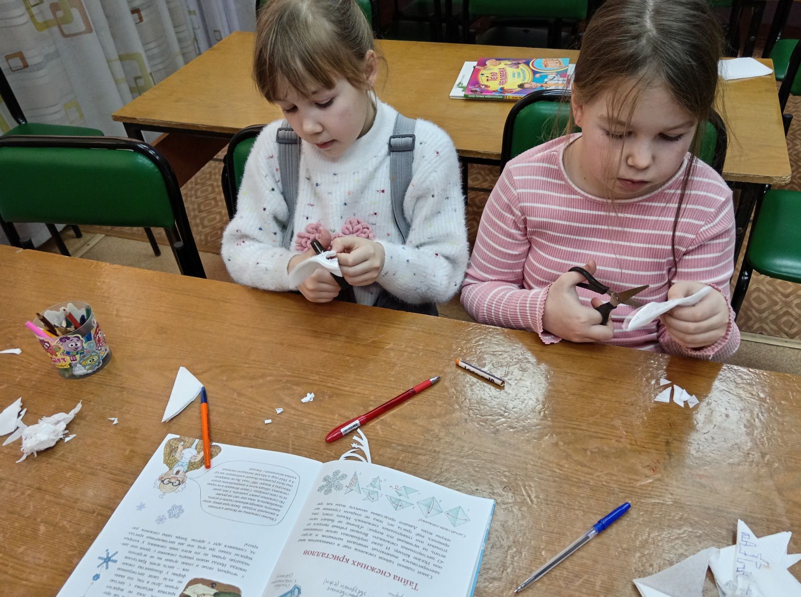 В конце занятия по книге «Красивые снежинки, вырезанные из бумаги» дизайнера Анны Зайцевой участники мероприятия научились создавать зимнее настроение своими руками.