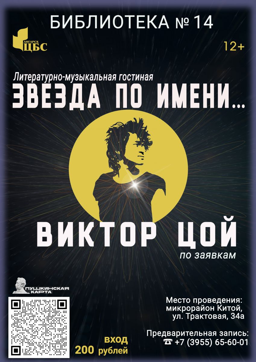 Библиотекари приглашают школьников старших классов, студентов и всех желающих в литературно-музыкальную гостиную по творчеству рок-музыканта, певца и композитора, автора песен, киноактера Виктора Цоя.