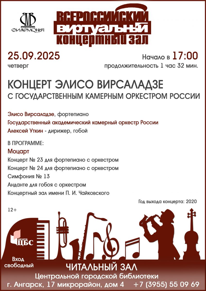 Поклонники творчества великого Моцарта будут в восторге! В программе, предлагаемой виртуальным концертным залом ангарской библиотеки, прозвучат известные произведения австрийского композитора. Вы услышите концерт № 23 для фортепиано с оркестром, концерт № 24 для фортепиано с оркестром, симфонию № 13 и анданте для гобоя с оркестром в исполнении музыкантов Государственного академического камерного оркестра России под управлением дирижера Алексея Уткина.