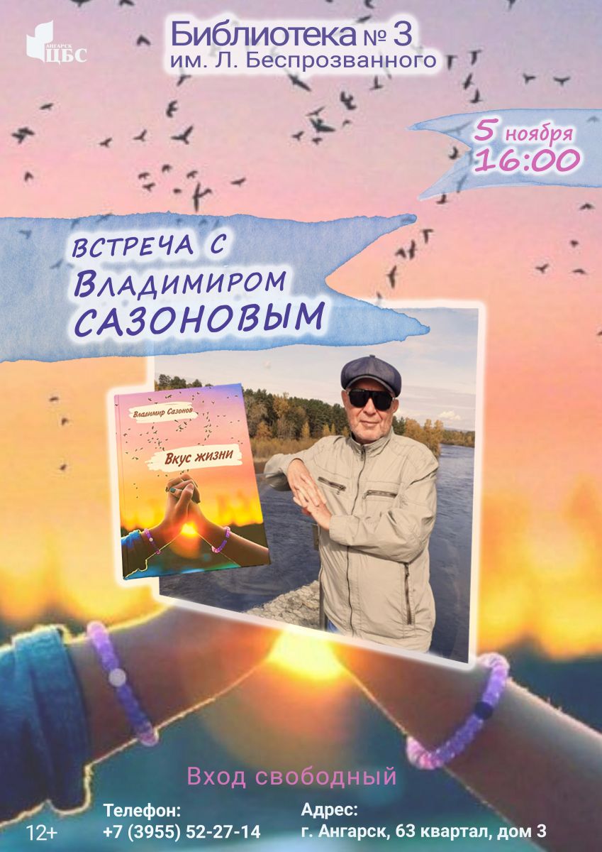 Библиотека № 3 им. Л. Беспрозванного приглашает вас на творческую встречу с ангарским поэтом Владимиром Сазоновым. Литератор представит свою новую книгу «Вкус жизни».