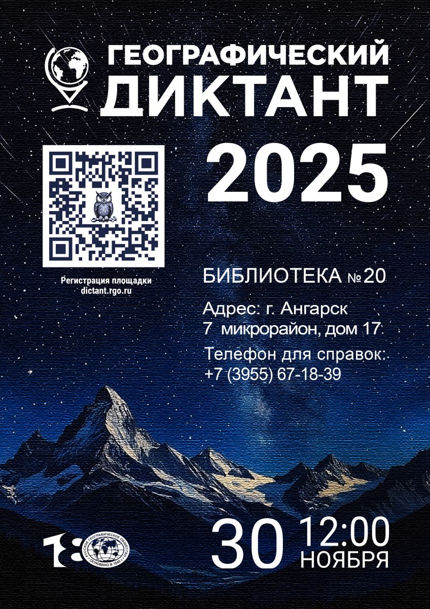 Библиотека № 20 приглашает всех желающих принять участие в ежегодной международной просветительской акции «Географический диктант», организованной Русским географическим обществом.