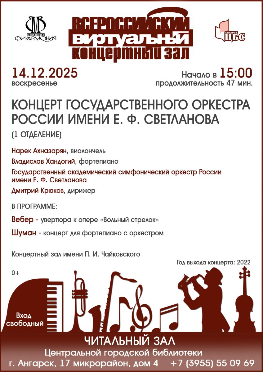 Виртуальный зал Центральной городской библиотеки Ангарска представляет концерт в двух отделениях Государственного оркестра России имени Е. Ф. Светланова под управлением дирижера Дмитрия Крюкова.