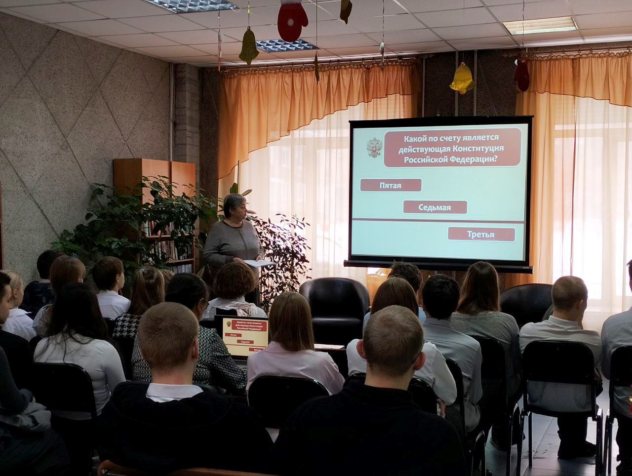 Для старшеклассников близлежащих школ, студентов техникумов, служащих Росгвардии сотрудники отдела «Абонемент» ЦГБ провели интеллектуальную викторину «Знатоки Конституции», вопросы в которой были посвящены главному документу России.