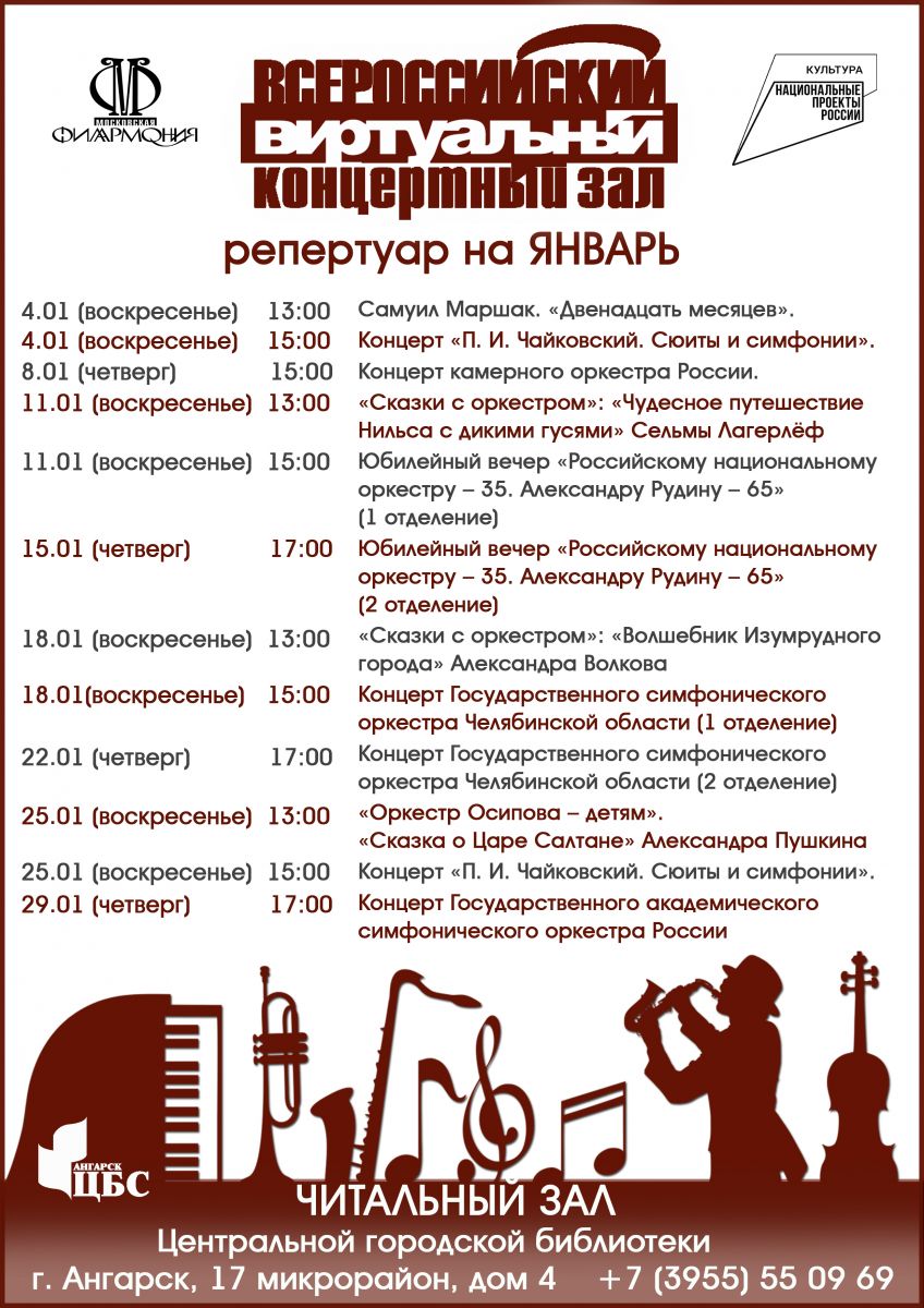 Виртуальный концертный зал. Репертуар на ЯНВАРЬ Ждем вас в январе (четверг, воскресенье) по адресу: г. Ангарск, 17 микрорайон, дом 4, читальный зал Центральной городской библиотеки.