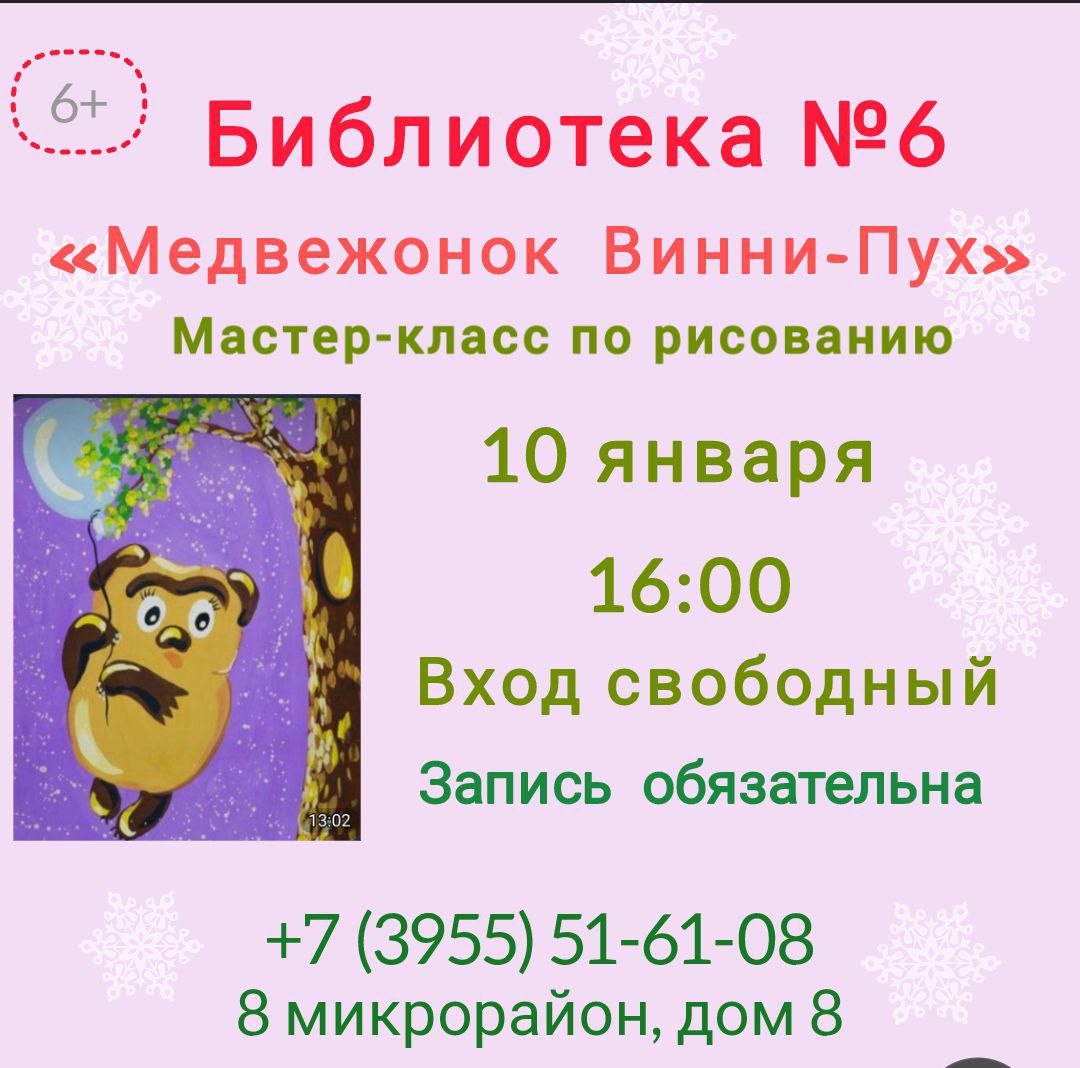 -16:00 — мастер-класс по рисованию «Медвежонок Винни-Пух». Вход свободный. 6+