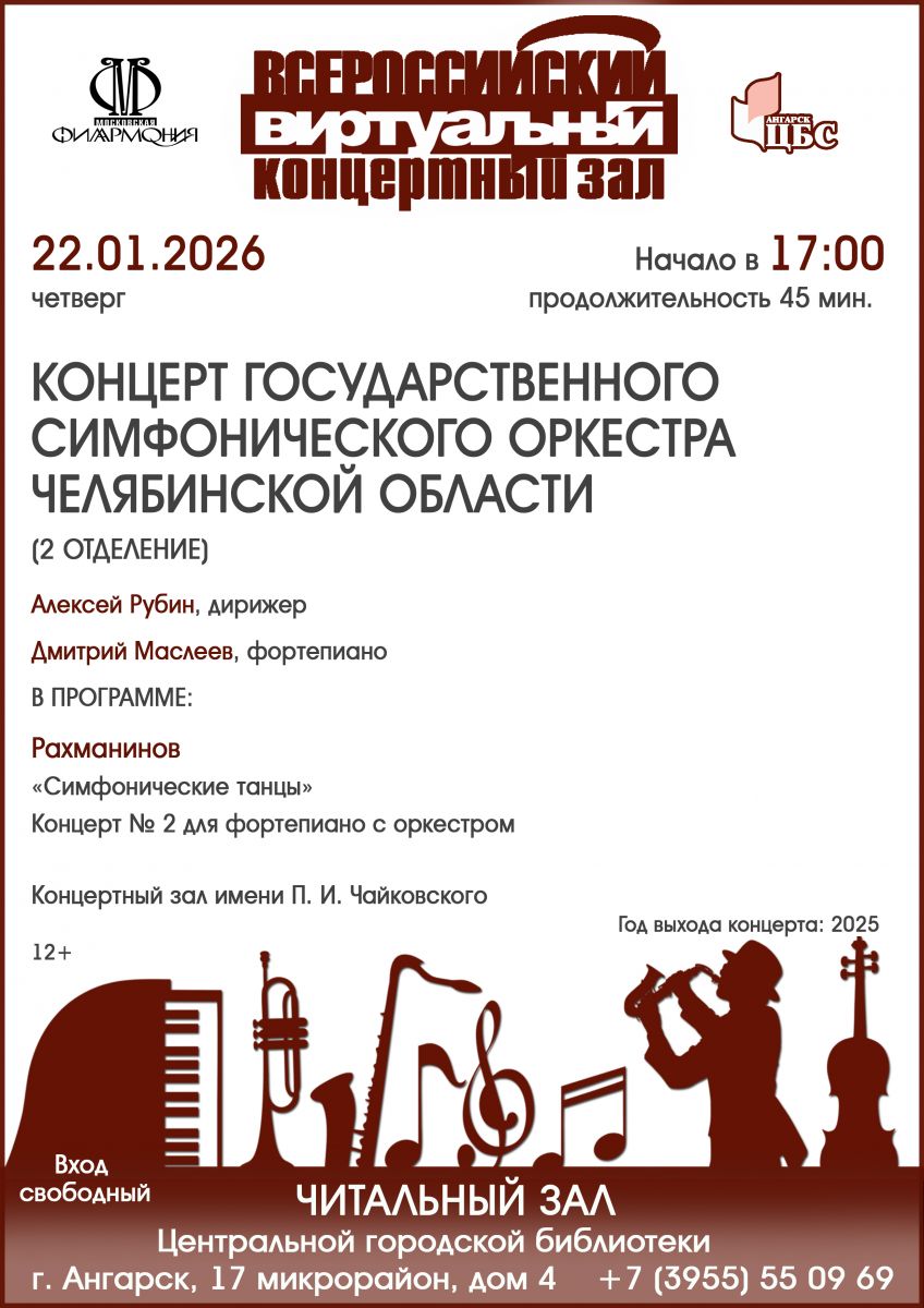 Во втором отделении концерта Государственного симфонического оркестра Челябинской области, которое смогут увидеть посетители виртуального концертного зала Центральной городской библиотеки Ангарска, прозвучат произведения русского композитора, пианиста, дирижера Сергея Рахманинова – «Симфонические танцы» и Концерт № 2 для фортепиано с оркестром.