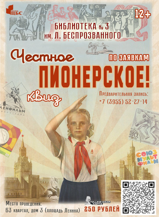 Музыка и литература, кино и история, спортсмены, ученые эпохи СССР и, конечно, пионеры – все это темы вопросов игрового молодежного турнира. Будет интересно. Честное пионерское! Предварительная запись команд – по телефону: +7 (3955)
