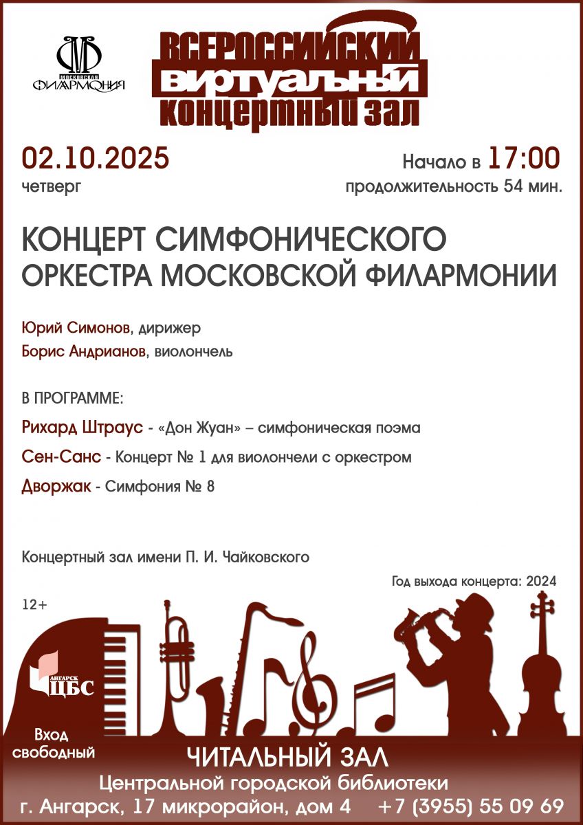 В программе концерта Академического симфонического оркестра Московской филармонии – замечательные музыкальные произведения. Посетители виртуального концертного зала Центральной городской библиотеки Ангарска услышат симфоническую поэму «Дон Жуан» немецкого композитора Рихарда Штрауса и Концерт № 1 для виолончели с оркестром французского автора Камиля Сен-Санса (первое отделение).