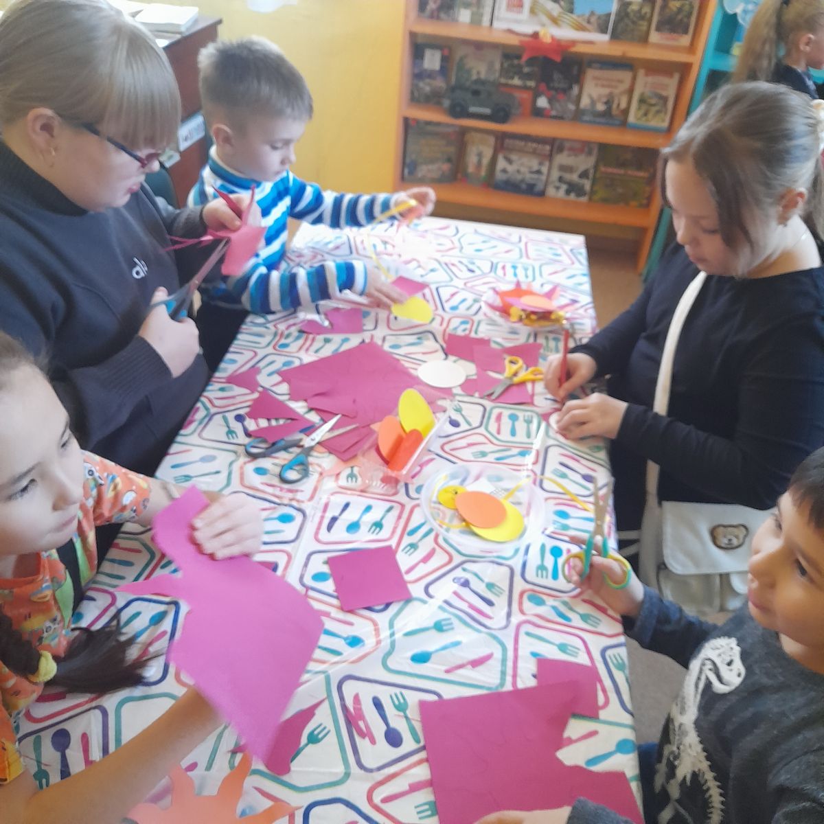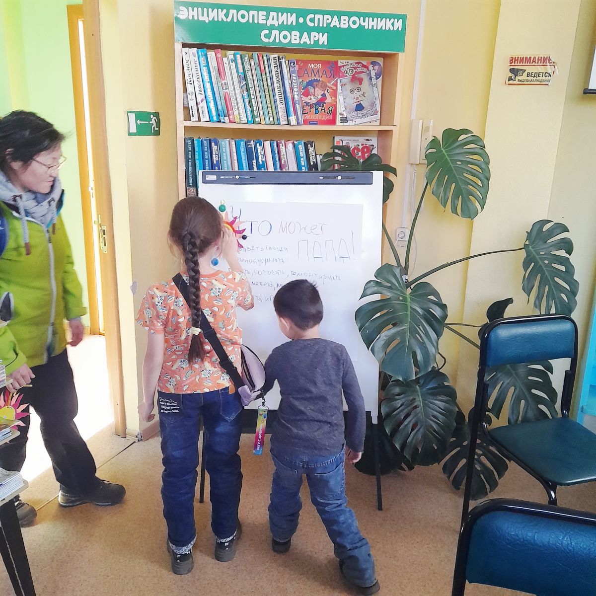 С азартом отгадывали загадки о мужских профессиях и различных инструментах. Выполняли веселые задания и писали на доске, что может папа. На мастер-классе выполнили кропотливую работу по изготовлению подвески-оберега в машину. В заключение познакомились с книгами на выставке «Отец – это звучит гордо!»