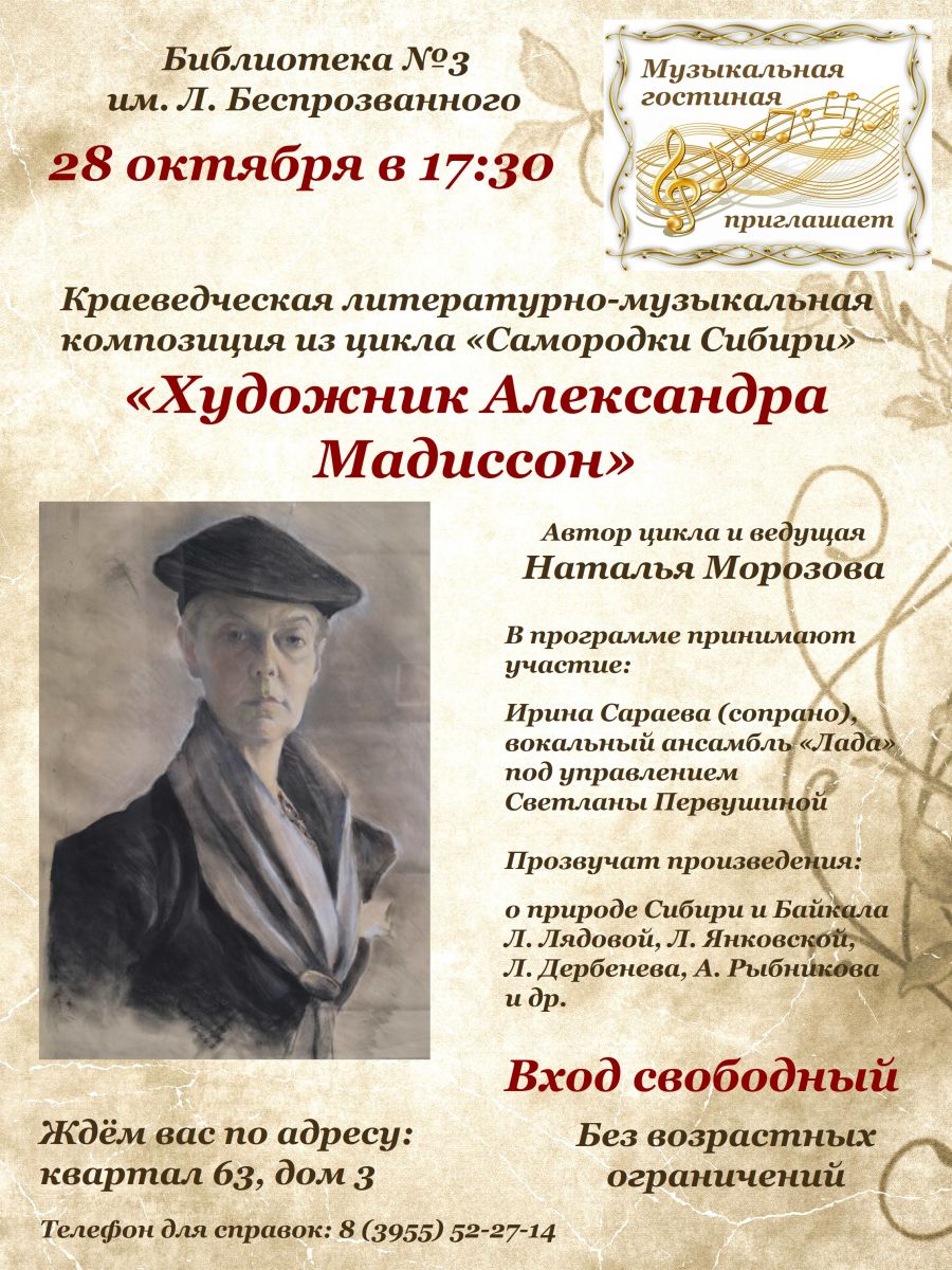 Александра Мадиссон (г. Самара) родилась 27 марта 1900 года. В 1917 году окончила Сызранскую гимназию и три года работала сельской учительницей. В 1920-е годы семья переехала в Эстонию. В 1921–1927 гг. обучалась на живописном отделении Высшей художественной школы «Паллас» (г. Тарту), у А. Ваббе. Освоила навыки в живописи и познакомилась с техникой гравюры. С началом Великой Отечественной войны вместе с семьей эвакуировалась в Иркутск и включилась в группу художников, работающих над плакатами «Окон ТАСС». С 1943 года возглавила коллектив «Окон ТАСС». Сумела организовать работу так, что мастерская работала в едином слаженном ритме до самого завершения войны. Оригиналы плакатов тиражировались в залах художественного музея. Лучшие образцы экспонировались на выставках в Москве. За годы войны Мадиссон создала около 100 плакатов, ряд картин и рисунков. Участвовала в выставках в Тарту и Таллине (1928–1936), с 1942 года – в Иркутске, Улан-Удэ, Новосибирске, Тюмени, Красноярске, Москве и Ленинграде. После войны жила и работала в Иркутске. Скончалась Александра Рихардовна 25 марта 1987 года в Иркутске. Ее работы находятся в Иркутском художественном музее им. В. П. Сукачёва.