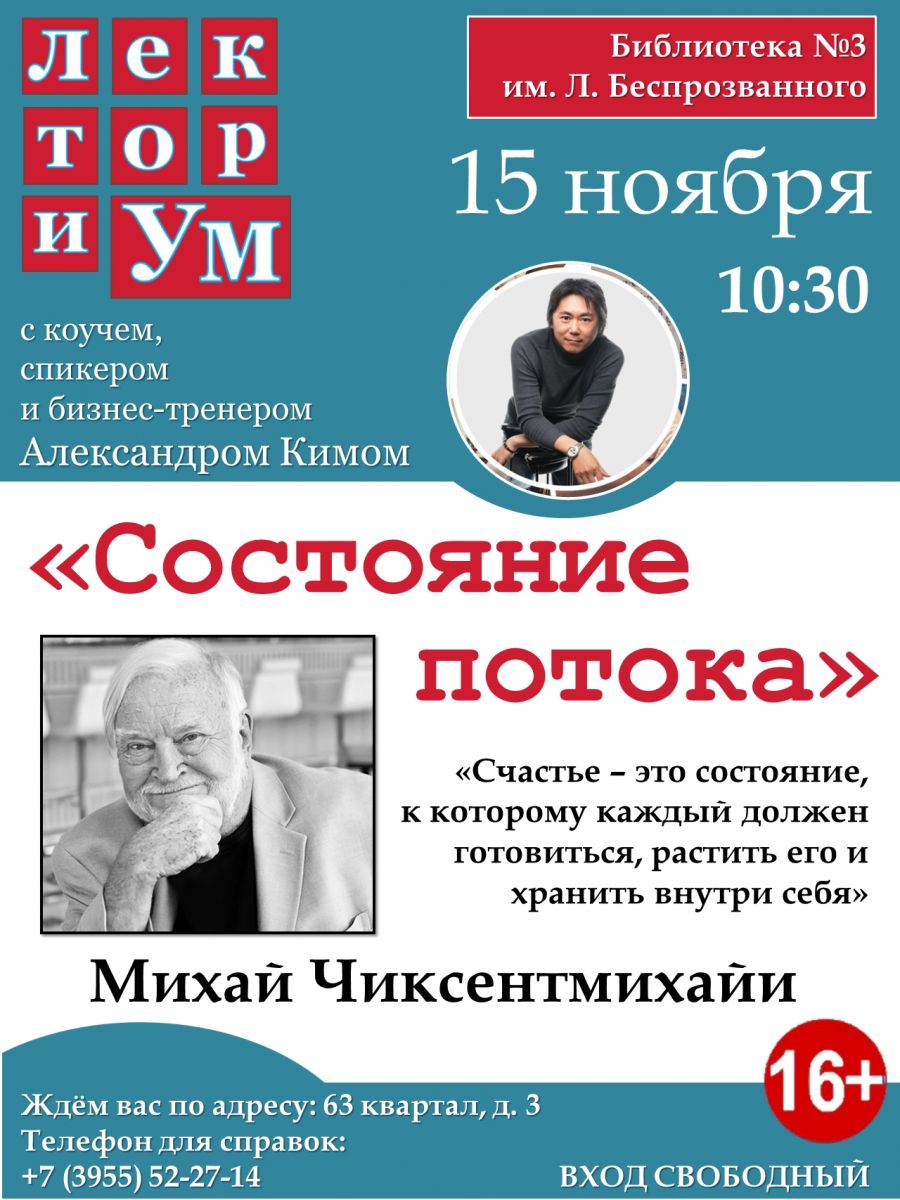 На встречи мы раскроем наследие знаменитого психолога Михая Чиксентмихайи, который оставил важную информацию о таинственном феномене — состоянии Потока. Эта лекция укажет путь к глубокому пониманию вашей собственной природы и позволит ощутить настоящее счастье от полного вовлечения в любимое дело.