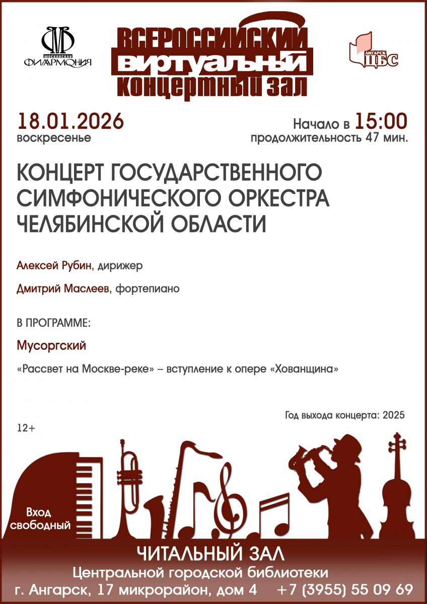 В первом отделении концерта Государственного симфонического оркестра Челябинской области, которое смогут увидеть посетители виртуального концертного зала Центральной городской библиотеки Ангарска, прозвучит вступление к опере «Хованщина» Модеста Мусоргского – «Рассвет на Москве-реке».
