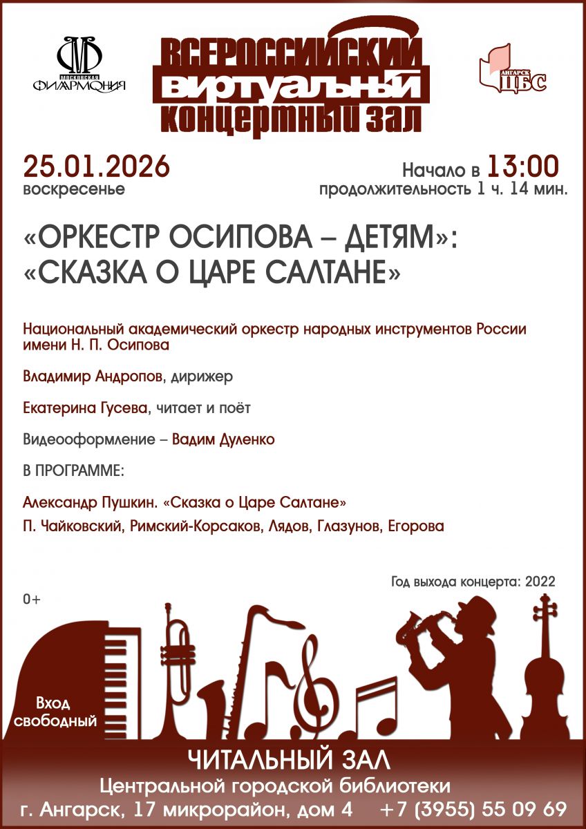 В цикле программ «Оркестр Осипова – детям» юные посетители виртуального концертного зала Центральной городской библиотеки Ангарска услышат бессмертную «Сказку о царе Салтане» Александра Сергеевича Пушкина.