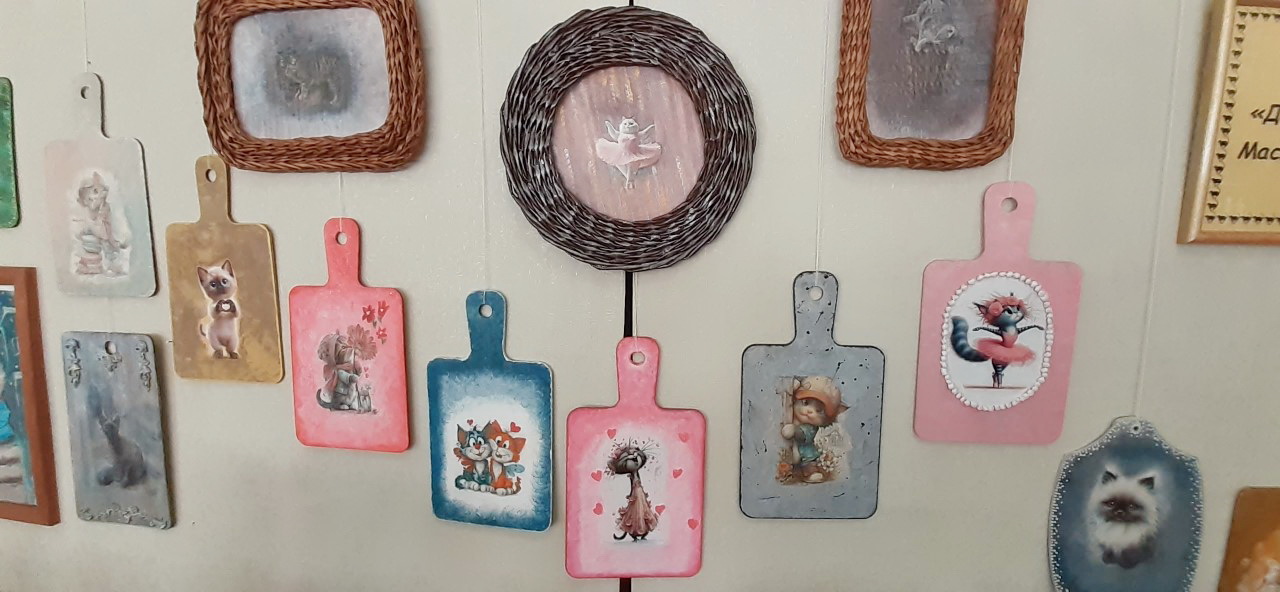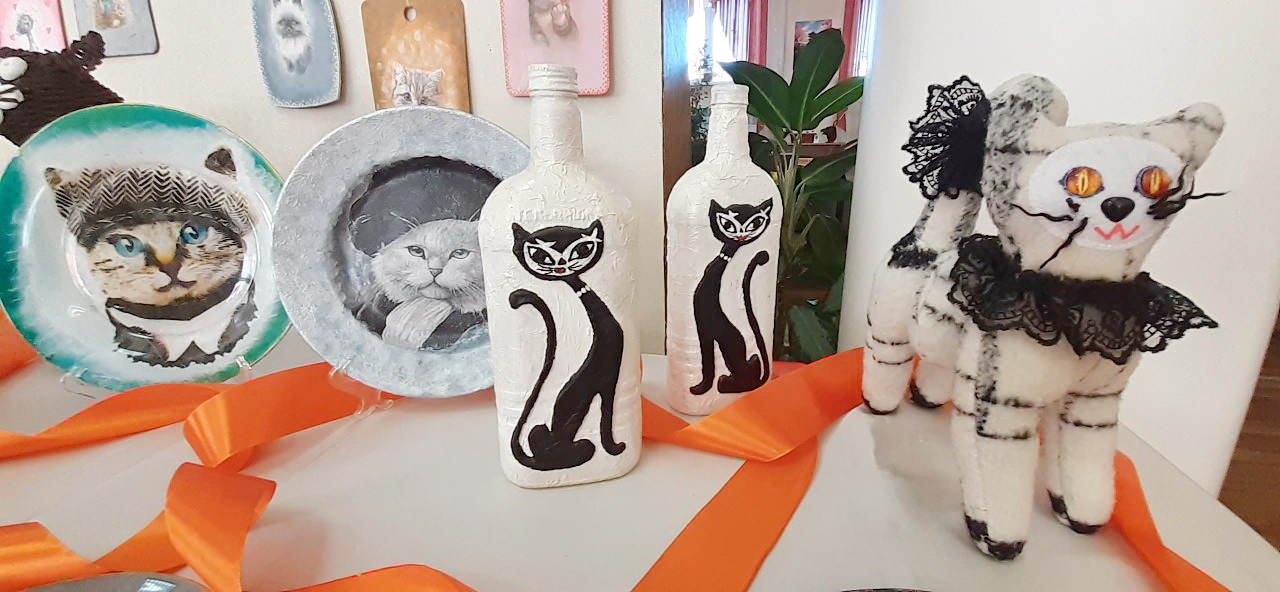 Рядом с куклами прекрасно ужились мартовские котики: вязаные, плетеные, текстильные, живописные. Любителям пушистиков непременно приглянется свой, близкий к душе: озорной, мечтательный, романтичный, дурашливый, гламурный или серьезный и интеллигентный.