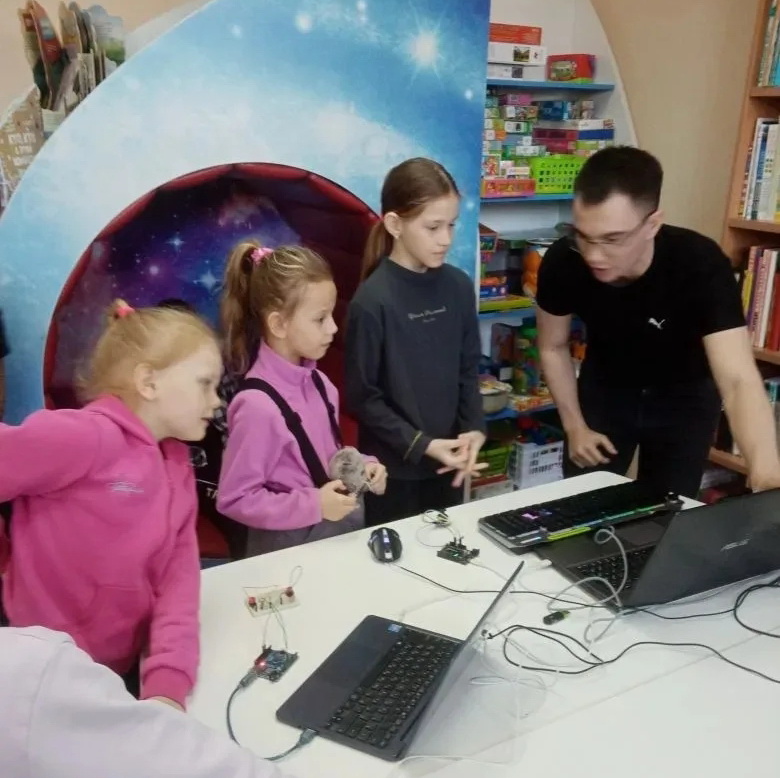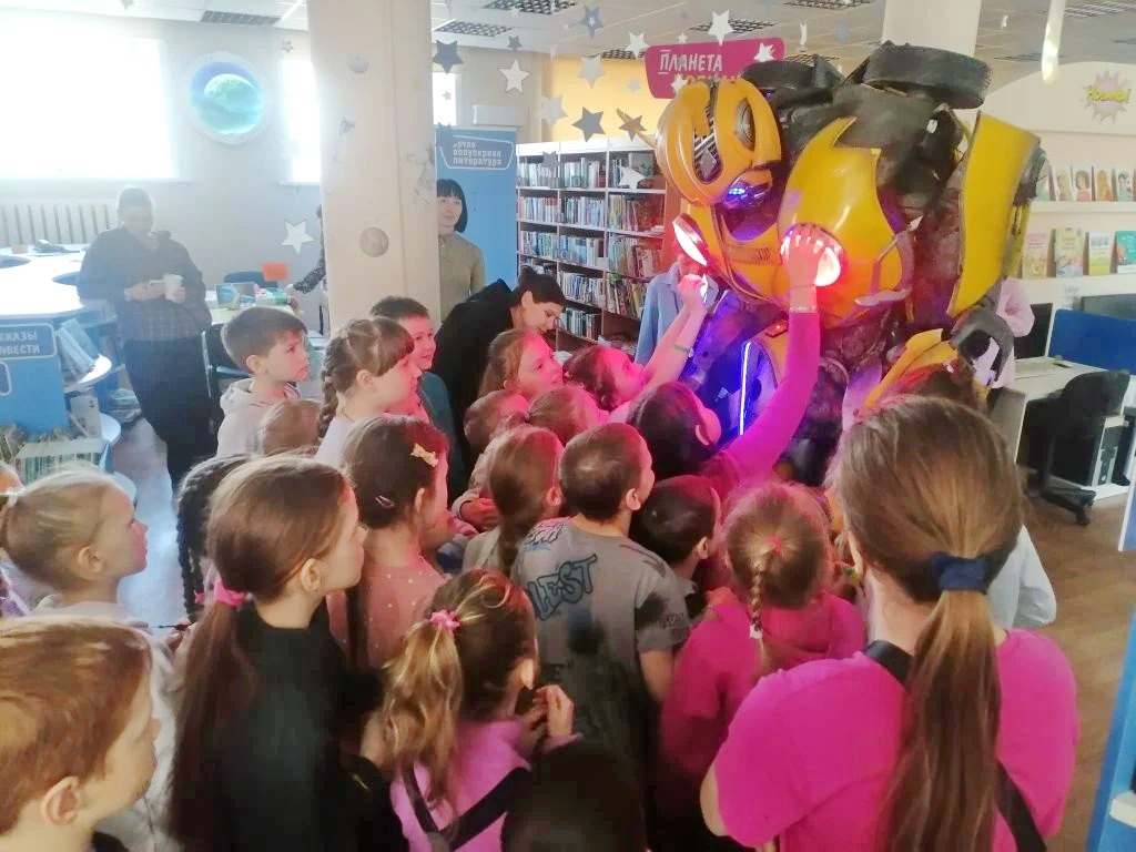 Участники мероприятия отправились в путешествие с важной миссией – спасти планету автоботов. Об этом ребят и родителей попросил сам инопланетный гость. Огромный робот-автобот – герой знаменитой серии комиксов – пришел на космический праздник совершенно неожиданно, от общения с великаном маленькие земляне остались в полном восторге. Разумеется, после такого сюрприза они с азартом отправились на поиски секретного шифра. Испытания были совсем не сложными и очень творческими. Своими руками участники изготовили книжные закладки-ракеты, а из воздушного пластилина создали свою солнечную систему. О ней, кстати, разговор продолжился и в библиотечном планетарии, где ребята наблюдали за звездами и за планетами, отвечали на вопросы.