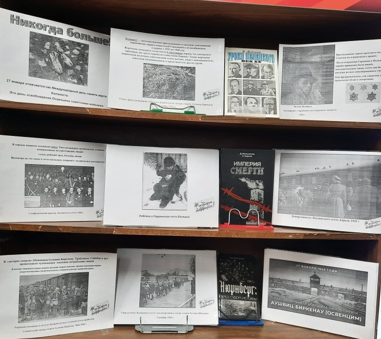 В связи с неделей памяти жертв холокоста в библиотеке № 20 организована выставка – галерея памяти «Никогда больше!». У выставки-галереи проводились обзоры.